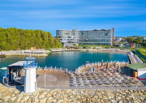 Разположение: Хотелът се намира на 90 км от летището в Анталия, на 35 км от Алания, в района на Окурджалар, на брега на морето. Построен е през 2020 г. на обща площ от 30 000 м².