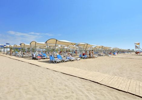 Плаж: Собствен пясъчен плаж точно пред хотела, удостоен със син флаг. Дължината на плажа е 220 м и платформа – 1800 м2. Шезлонги, чадъри, матраци, плажни кърпи - безплатно. Душ, съблекални. Павилиони на плажа, кея и край басейна (срещу заплащане).