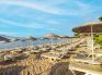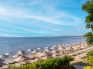 Собствен, пясъчен, притежаващ сертификат "Син флаг". Чадъри, шезлонги, матраци на плажа и при басейна - безплатно. Плажни кърпи не се предлагат.