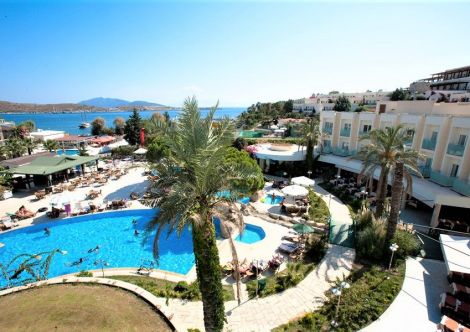 на 3 км. от Бодрум в центъра на Гюмбет, на брега на морето и 38 км. от летище Бодрум