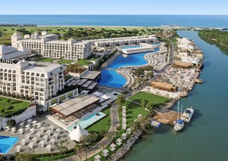 Titanic Deluxe Golf Belek се намира в Белек, на брега на морето, между уникално красивата река Бешгьоз и голф клуб Titanic. Хотелът е на 30 минути път с кола от международното летище Анталия и на 35 минути от центъра на града. Състои се от шест етажна основна сграда, седем триетажни сгради и седемнадесет двуетажни вили.