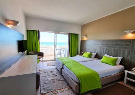 В стаите: Хотелът разполага с общо 330 стаи, разположени в четириетжна сграда с 2 асансьора - Standard Room (24-26 кв.м), Sea View Room (24-26 кв.м), Family Room (26-28 кв.м с една спалня), Superior Family Room (36-38 кв.м с две спални, отделени с врата). Всички стаи са оборудвани с климатик, телевизор, мини бар (ботилирана вода в деня на настаняване), баня с душ/вана, сешоар, сейф, балкон/тераса. Почистване на стаите - всеки ден.