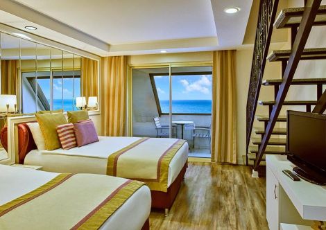 Стая 26 кв.м с балкон и директен морски изглед, с едно двойно и едно единично легло, диван, подходяща за 3+1 или 2+2 души, с баня с душ и тоалетна, климатик, минибар, сейф, LCD телевизор, безплатен Wi-Fi, ежедневно почистване и възможност за бебешка кошара.
