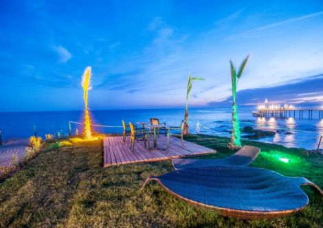 Разположение: Хотелът се намира само на 150 м от частично скалистия, пясъчно -чакълест плаж. Разстоянието до центъра на Алания е 22 км, където се намират и множество търговски и развлекателни съоръжения, магазини, бутици, пазари, барове. Разстоянието е достъпно от хотела с частно такси или обществен транспорт. Международното летище на Анталия е приблизително на 100 км