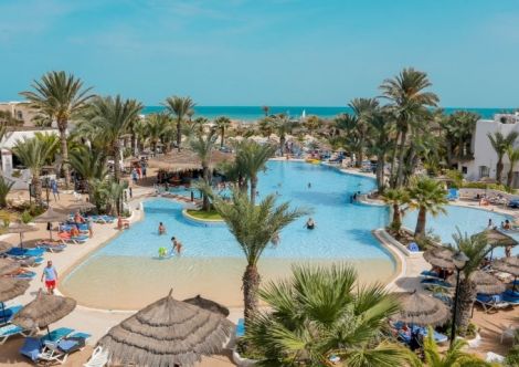 Разположение : Fiesta Beach се намира на един от най-красивите плажове на остров Джерба. Този ол инклузив хотел, проектиран като село Джербиен е с голяма зелена територия и широк великолепен плаж. Хотелът се намира в района на Мидун, на 8 км от центъра на града, на 15 км от столицата на острова Хумт Сук. Летище Джерба-Зарзис се намира на 25 км. Перфектен избор за семейства с деца.