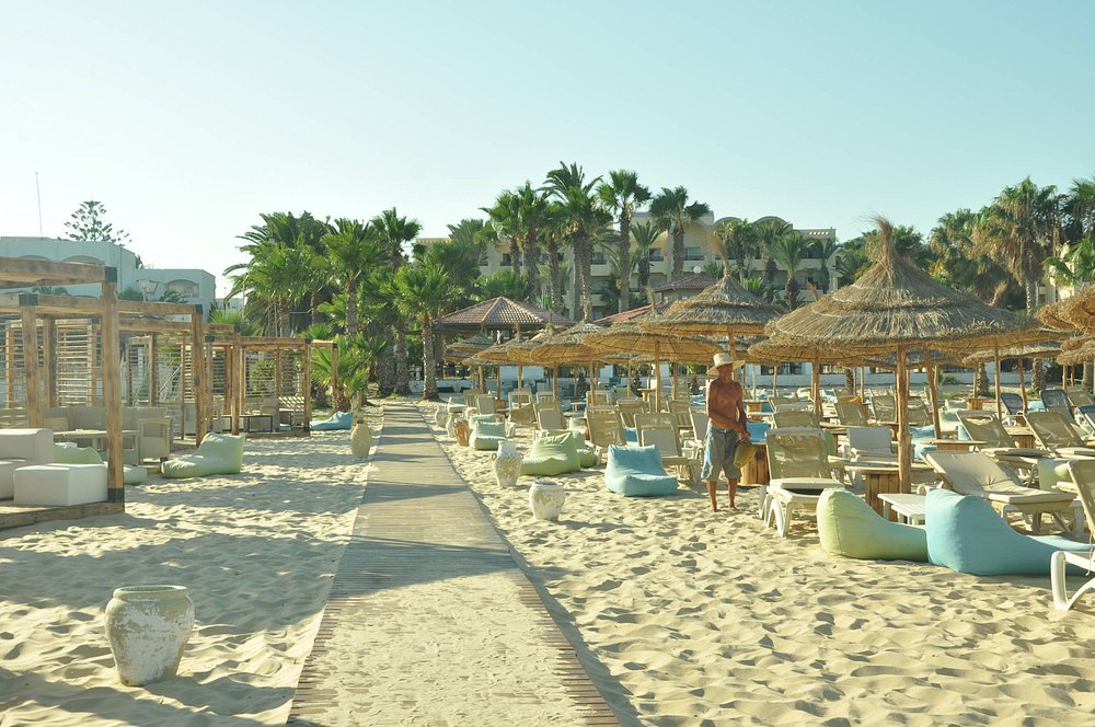 Собствен пясъчен плаж, на втора линия, на 650 м от хотела. Чадъри и шезлонги на плажа и басейна - безплатно.