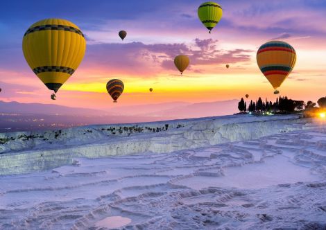 Полет с балон с горещ въздух над снежно белите варовикови травертини на Памуккале, долината Меандър и известните останки на древния град Хиераполис. Ще се насладите на спиращите дъха панорамни гледки от над 1000 метра височина, ще дегустирате шампанско и ще получите сертификат за участие в полета.